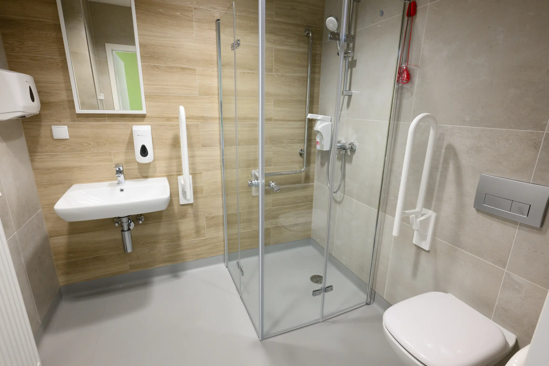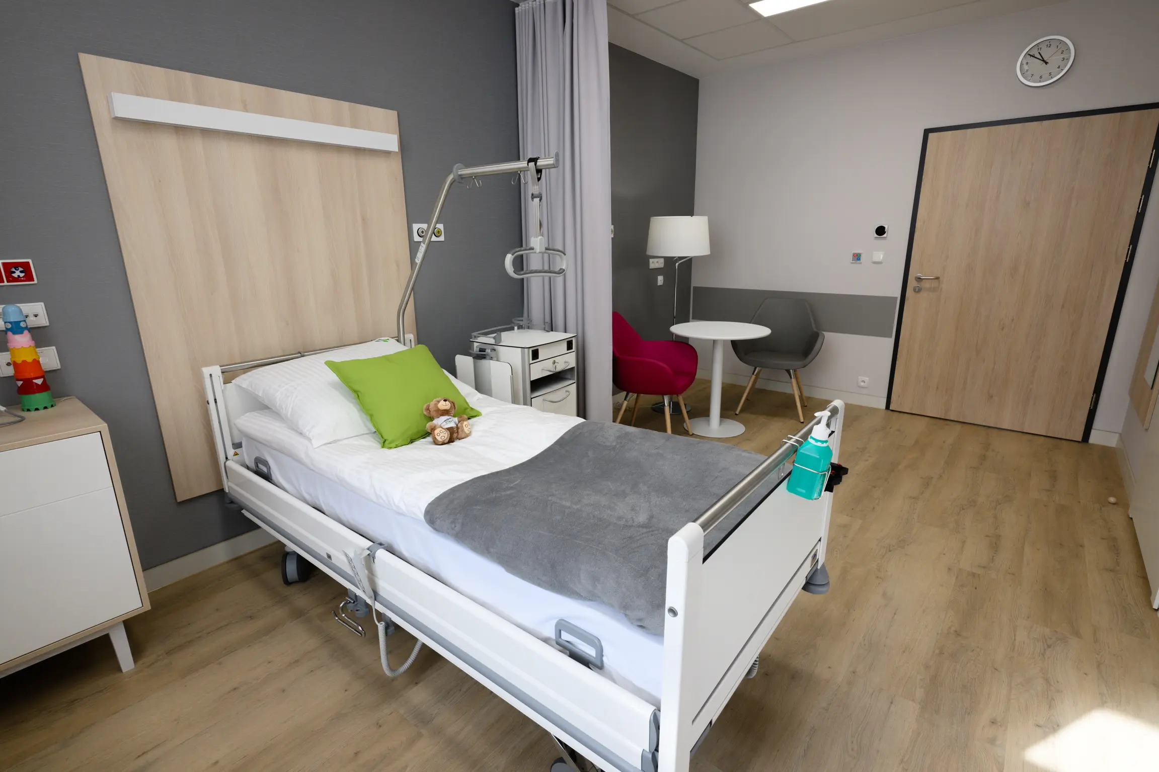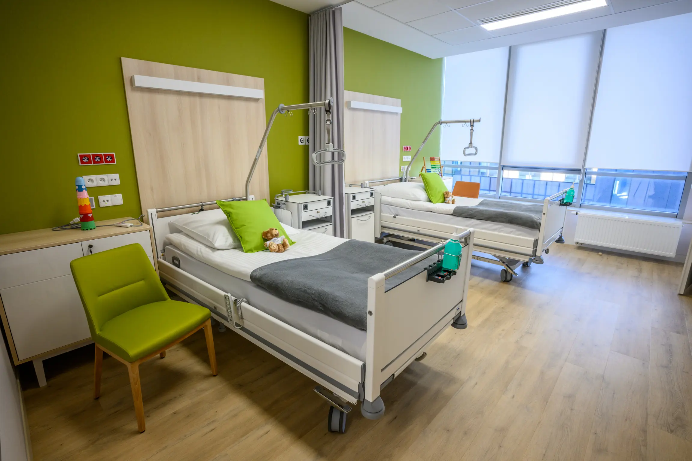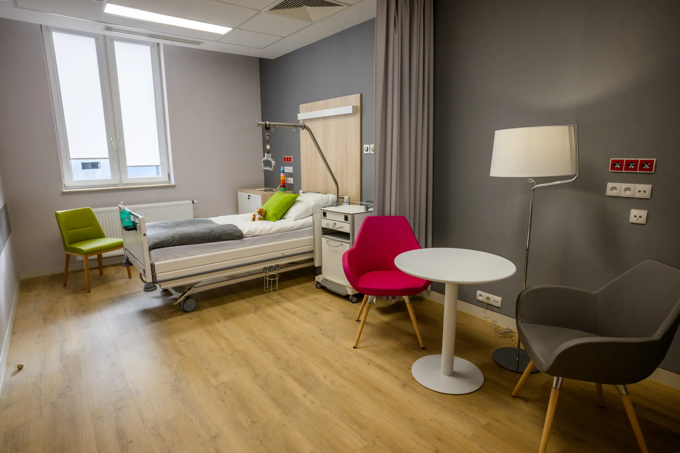 Każdy z pokoi szpitalnych został starannie zaprojektowany z myślą zarówno o dzieciach, jak i rodzicach. W każdym z nich znajduje się miejsce do odpoczynku dla rodzica, prywatna łazienka oraz telewizor, co ma na celu stworzenie atmosfery sprzyjającej szybkiemu powrotowi do zdrowia.