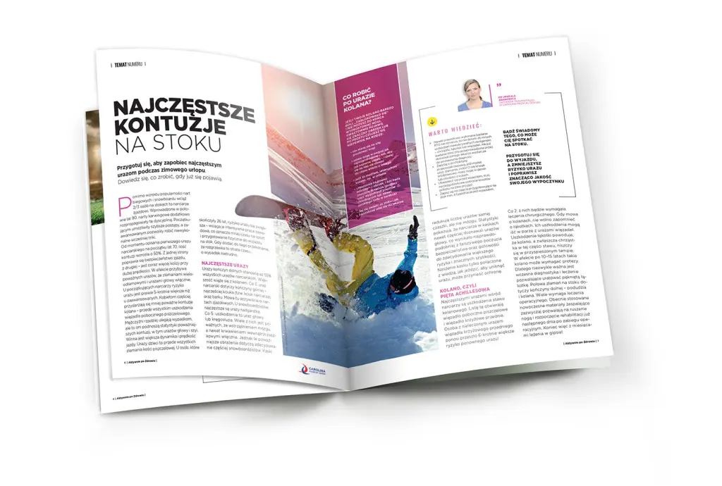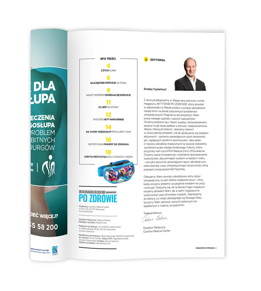 Pierwsze wydanie poświęcone jest głównie sportom zimowym i zawiera praktyczne wskazówki dotyczące tego, jak przygotować się do zimowego wyjazdu, by w pełni wykorzystać czas spędzony z najbliższymi. Nasi specjaliści podpowiadają Państwu – jakie są najczęstsze kontuzje na stoku i co robić jak już się wydarzą; co jeść, aby optymalnie i bezpiecznie eksploatować swój organizm na stoku oraz jak dobraćbuty, nie tylko narciarskie, aby zapobiec bólom i schorzeniom stóp.