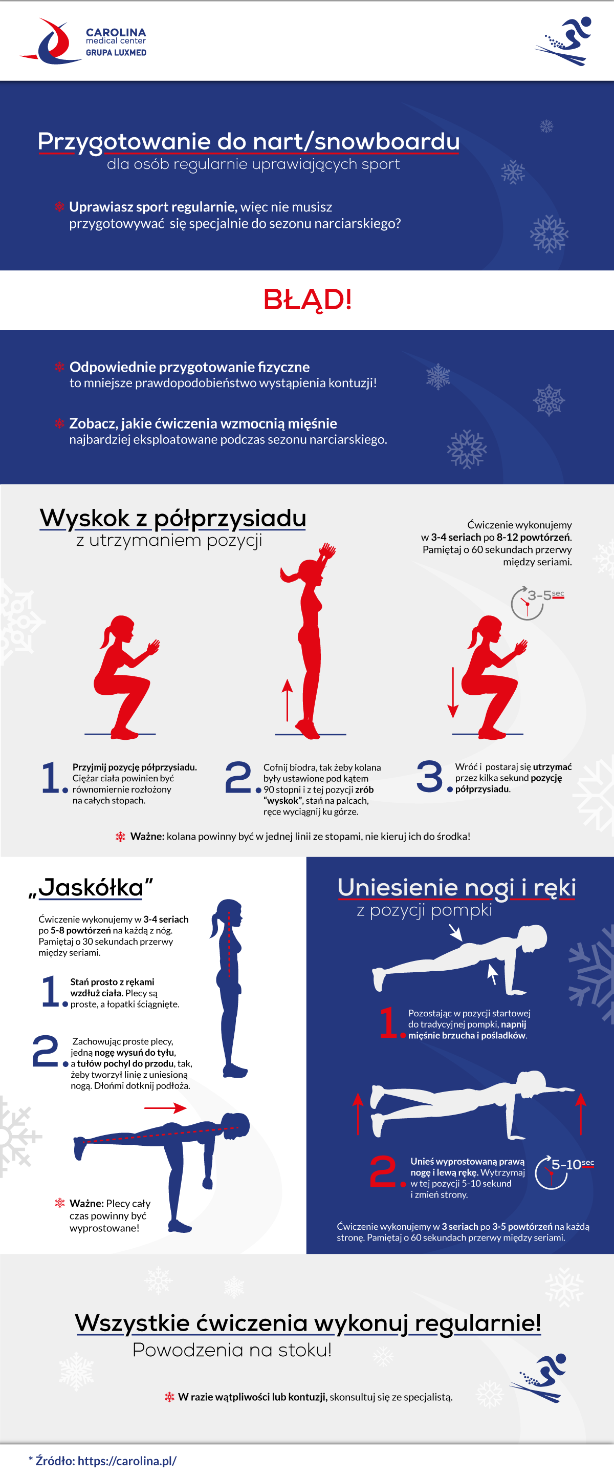 Osoby nieprzygotowane kondycyjnie doznają kontuzji na stoku aż sześciokrotnie częściej, niż ich aktywni koledzy – mówi lek. Krzesimir Sieczych, specjalista ortopedii i traumatologii z kliniki Carolina Medical Center.