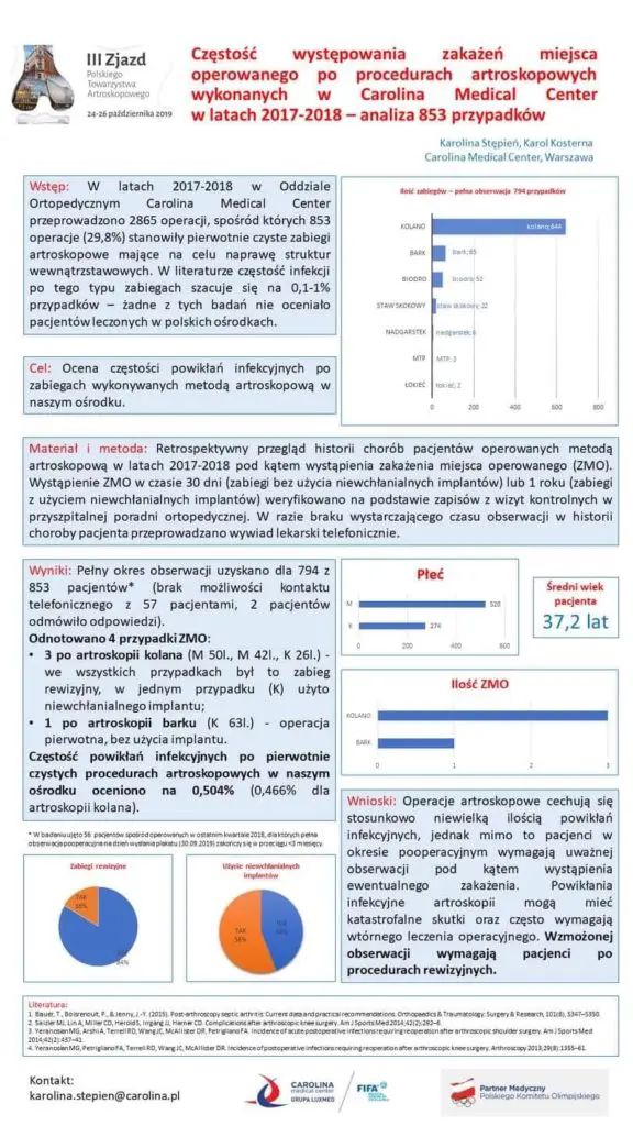 W dniach 24-26 października odbył się największy Ogólnopolski Kongres Polskiego Towarzystwa Artroskopowego (PTArtro). W trakcie Zjazdu specjaliści Carolina Medical Center mieli przyjemność wygłosić szereg wystąpień naukowych (lista wykładów poniżej). Nie zabrakło również wystąpień plakatowych (K. Stępień, K. Kosterna: Częstość występowania zakażeń miejsca operowanego po procedurach artroskopowych wykonanych w Carolina Medical Center w latach 2017-2018 – analiza 853 przypadków). III Zjazd Polskiego Towarzystwa Artroskopowego był idealną okazją do dyskusji i wymiany poglądów ze specjalistami z całej Polski.