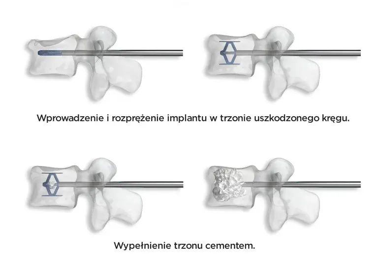Zabieg z wykorzystaniem Spine Jack® System trwa od 30 do 45 min. Polega on na przezskórnym wprowadzeniu dwóch igieł przeznasadowych. Dzięki nim neurochirurg jest w stanie umieścić w trzonie druty Kirschnera, które stanowią prowadnice dwóch narzędzi dostępowych – wiertła oraz przymiaru implantów. Po przygotowaniu przestrzeni wewnątrz trzonu, wprowadzane są dwa owalne, rozprężane implanty do trzonu uszkodzonego kręgu. Następnie lekarz nastawa złamanie przez stopniowe, obustronne rozprężanie implantów aż do momentu odtworzenia anatomicznej wysokości złamanego trzonu. Powstała w ten sposób przestrzeń w trzonie wypełniona zostaje cementem, którego zadaniem jest usztywnienie konstrukcji i utrzymanie osiągniętego efektu nastawienia.