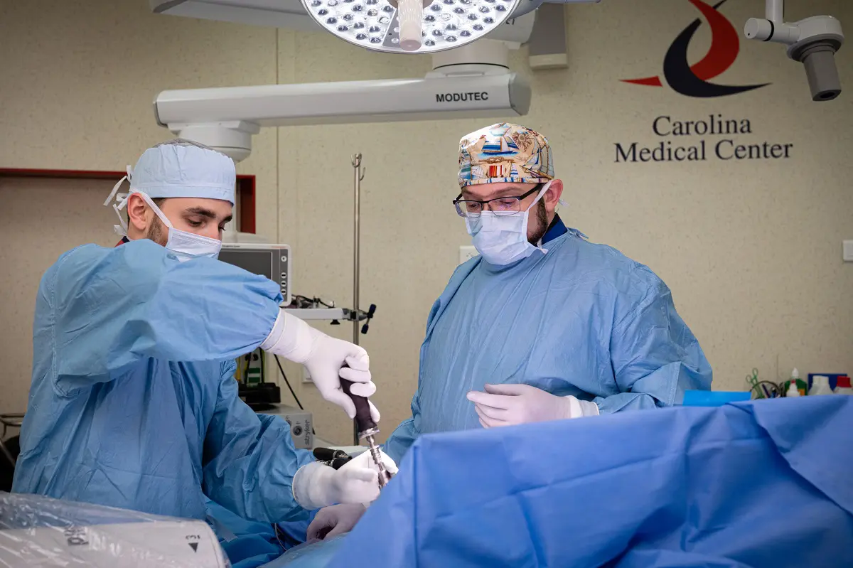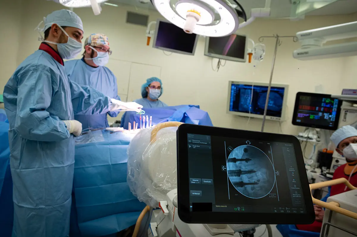Lek. Jakub Sobczyk w trakcie operacji wraz z lek. Jurijem Kseniukiem, Ordynatorem Oddziału Chirurgii Kręgosłupa w Carolina Medical Center.